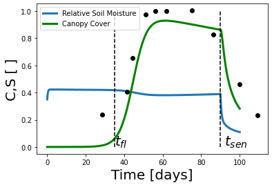consisting of three coupled differential equations tracking water in the soil, canopy, and total reproductive biomass throughout a kidney bean plant’s life cycle. This